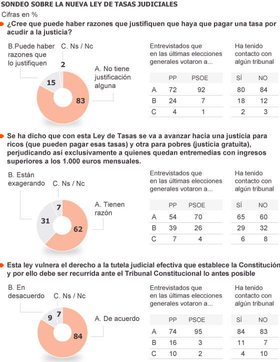 El rechazo ciudadano a la nueva ley de tasas es generalizado. La medida la desaprueban tanto los votantes del PSOE como los del PP. Así queda reflejado en una encuesta elaborada por Metroscopia para elConsejo General de la Abogacía. Para dos de cada tres, no exageran quienes apuntan que esta norma va a dar lugar a una justicia de ricos y otra de pobres, y que el peso de estas tasas recaerá sobre las clases medias. El 84% considera que vulneran el derecho a la tutela judicial efectiva que establece la Constitución y por tanto deben ser recurridas ante el Tribunal Constitucional “lo antes posible”.